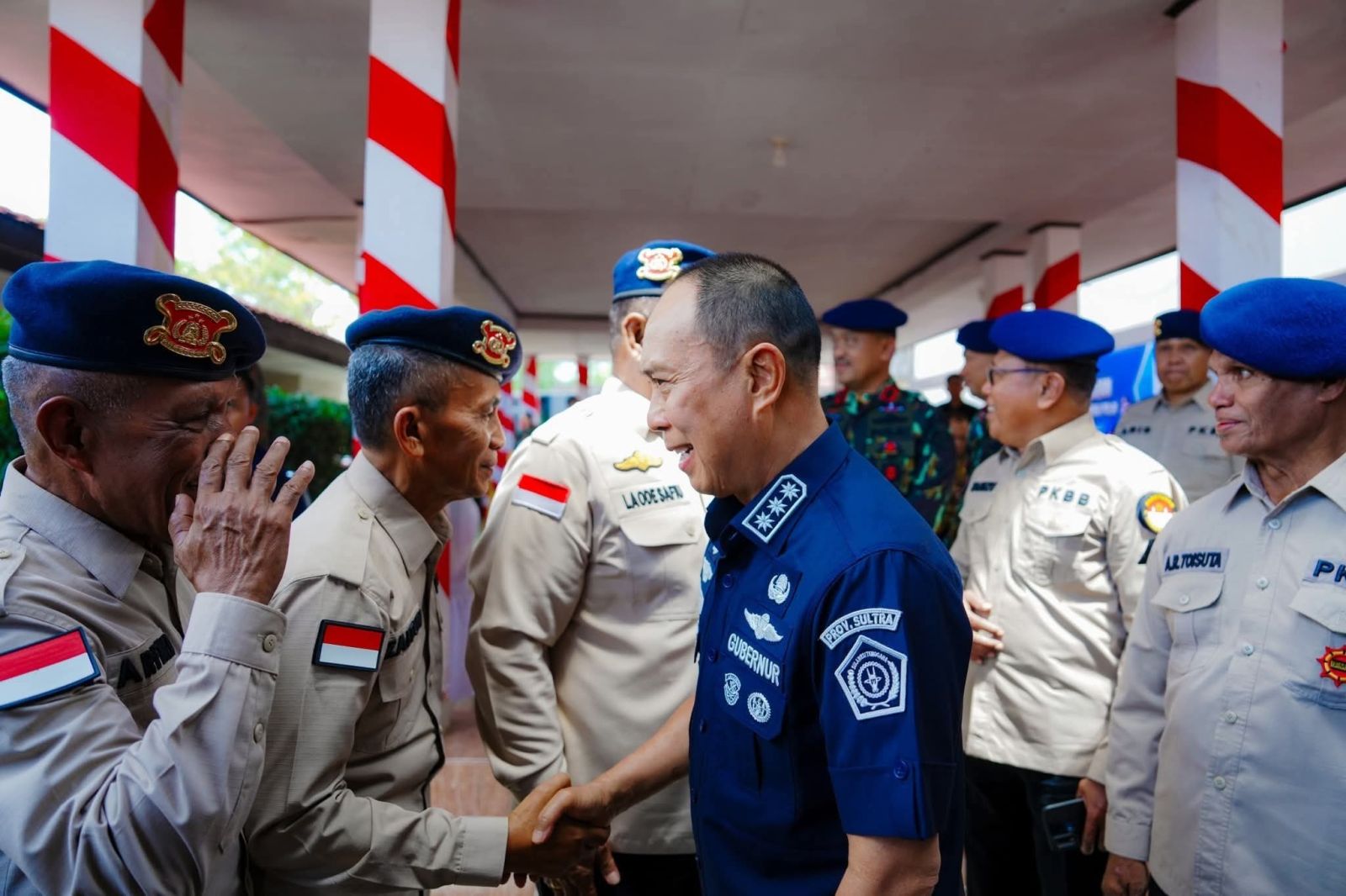 Gubernur Sultra berjabat tangan dan menyapa personel Brimob dalam perayaan HUT ke-80 Brimob di Mako Satbrimobda Sultra. Foto: PPID Sultra